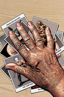 Part A of the Conclusion cock-a-doodle-doos with a robot painting a wall–yet another clever way of insinuating the title of the book into the story itself–and wakes with Rosetta’s reminding us of “the quest for” Mercedes, who is still holed up in the Municipal Purgatorium. Motter makes his way through the remainder of the the first half of the finale by employing inventive panel-to-panel transitions, witty banter, a pair of well-placed stories (a fun one about the Ajax and a philosophical one about anatomically-themed tattoos), and by closing the the whole puppet show with a some silly symmetry: Mister X breaks the fourth wall–not the freshly painted one, much to the relief of a certain robot–as he explains how he “just happened to bring cable cutters” to the Purgatorium: he slyly states, “They were useful some pages back.” I mean, duh. Oh, and, uh, he and Rosetta get captured, so…